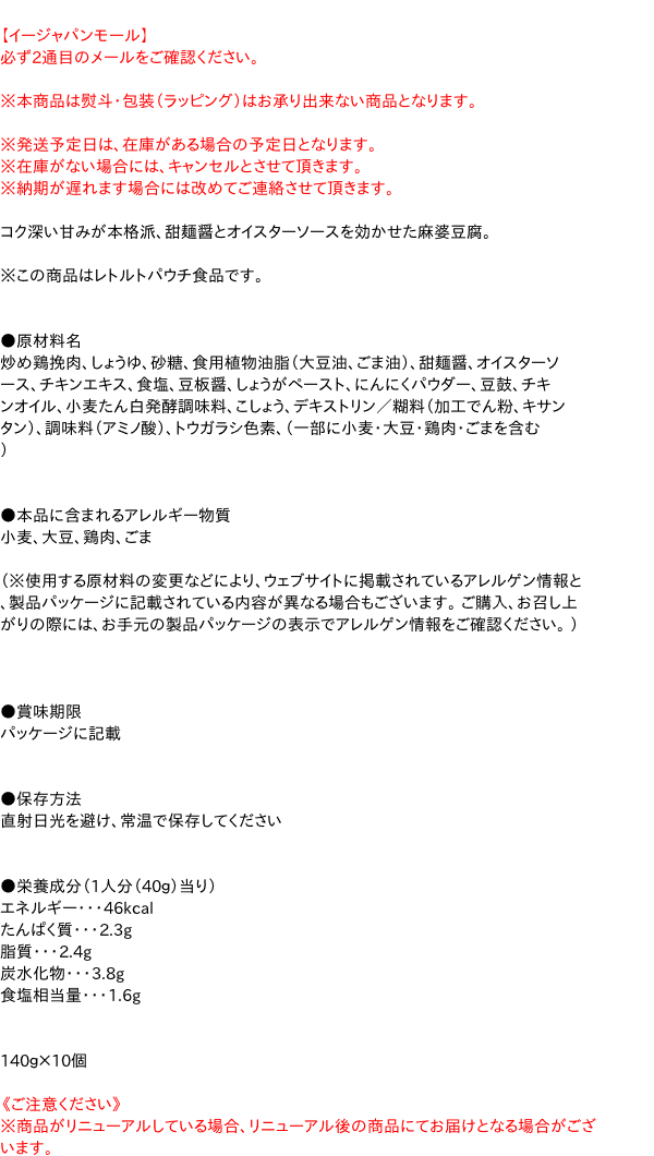 [関連キーワード:食品 レトルト 調理の素 中華 中華惣菜 マーボー豆腐 まーぼーとうふ クックドゥ 簡単]味の素 CookDoあらびき肉入り麻婆豆腐用 はコチラ >>【イージャパンショッピングモール】内のみのお買い物は、送料一律でどれだけ買っても同梱する事が出来ます。