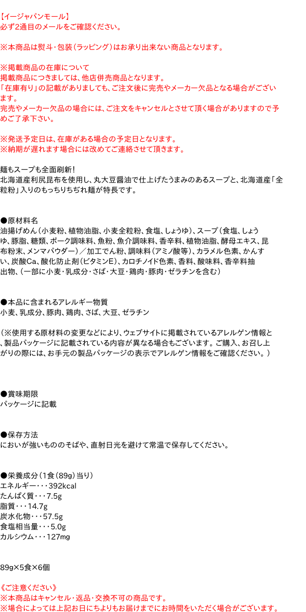 ●栄養成分(1食(89g)当り) エネルギー・・・392kcal たんぱく質・・・7.5g 脂質・・・14.7g 炭水化物・・・57.5g 食塩相当量・・・5.0g カルシウム・・・127mg 89g×5食×6個【メーカー・製造または販売元】日清食品株式会社0120-923-301【広告文責】株式会社イージャパンアンドカンパニーズ 072-875-6666《ご注意ください》 ※商品がリニューアルしている場合、リニューアル後の商品にてお届けとなる場合がございます。