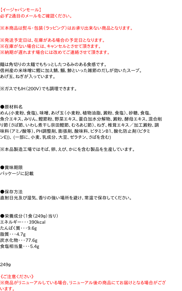 ●原材料名 めん(小麦粉、食塩)、味噌、あげ玉(小麦粉、植物油脂、澱粉、食塩)、砂糖、食塩、魚介エキス、みりん、鰹節粉、野菜エキス、蛋白加水分解物、澱粉、酵母エキス、混合削り節(さば節、いわし煮干し宗田鰹節、むろあじ節)、ねぎ、椎茸エキス/加工澱粉、調味料(アミノ酸等)、PH調整剤、膨張剤、酸味料、ビタミンB1、酸化防止剤(ビタミンE))、 (一部に、小麦、乳成分、大豆、ゼラチン、さばを含む) ※本品製造工場ではそば、卵、えび、かにを含む製品を生産しています。
